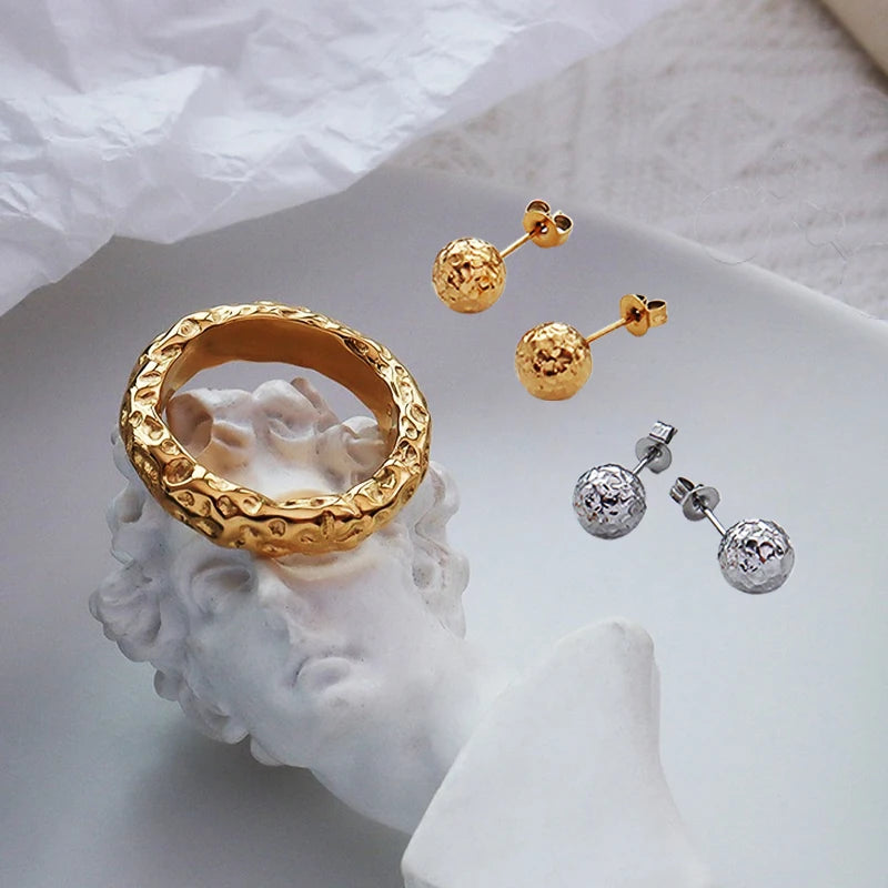 Nivora Stainless Steel Rings Stud Earrings For Women Simple Fashion Hammer Face Statement Jewelry Set Waterproof Allergy-proof