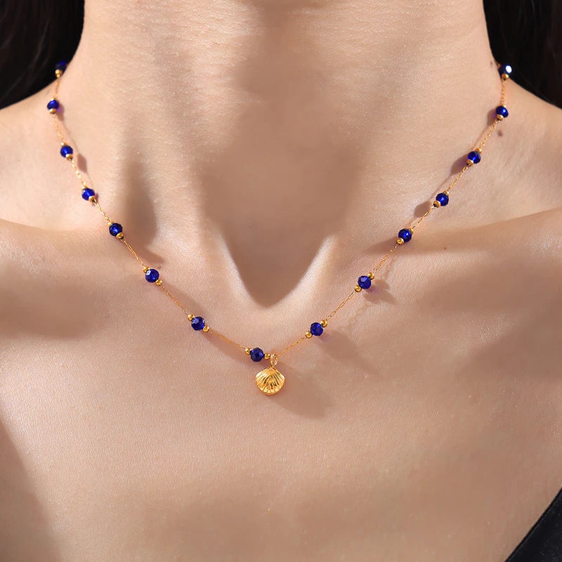 Ocean Style Purple Crystal Beads Necklace Dangle Earrings For Women Stainless Steel Thin Chain Scallop Pendant Jewelry Sets